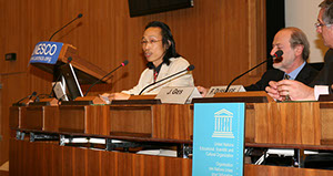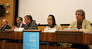 Li Zili et les différents intervenants sur la scène lors du colloque « Des arts culturels internationaux » à l'UNESCO en 2012
