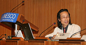 Li Zili en plein discours lors du colloque « Des arts culturels internationaux » à l'UNESCO en 2012.