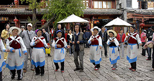 Li Zili danse avec les femmes traditionnelles Naxi à Lijiang au Yunnan, à l'été 2010