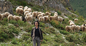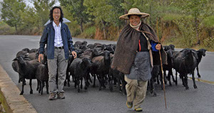 Li Zili accompagne une bergère appartenant à l'ethnie minoritaire Yi et son troupeau de mouton au Yunnan,