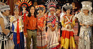 Li Zili entouré de filles traditionnelles issues de minorités ethniques de Yunnan au Yunnan, en avril 2010