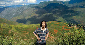 Li Zili devant des cultures en terrasse à Dongchuan au Yunnan, en avril 2010